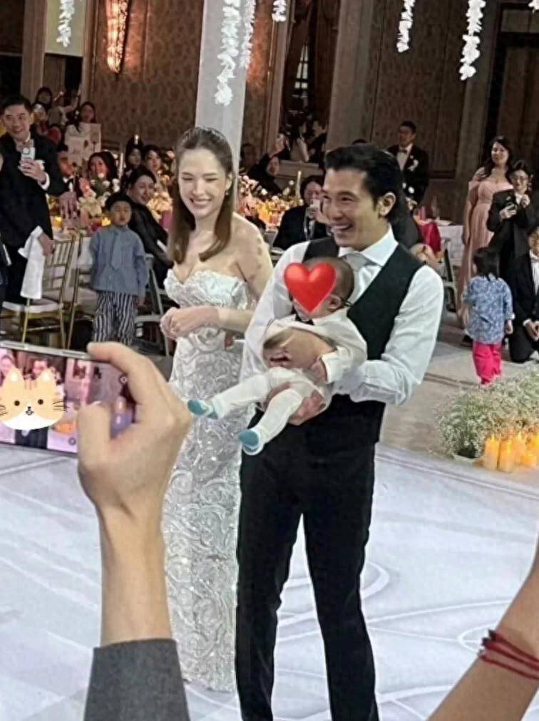 Ian成为整场婚礼的节奏掌控者。戴着迷你墨镜的小家伙一开始有点怕生,但很快适应热闹场面。婚礼进行到一半被保姆带到休息室,邱泽每隔半小时就要跑去查看。现场照片捕捉到父子对视的瞬间:邱泽笑得眼角纹挤出,Ian歪着小脑袋似懂非懂地回应。